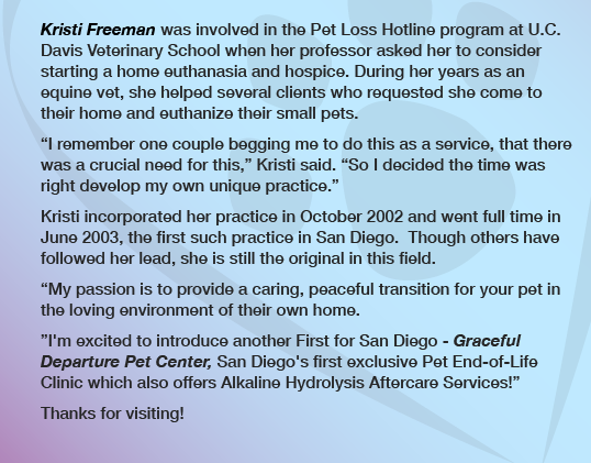 Kristi's Home Page Information and Fees Pet Loss Information Client Testimonials Hospice Care/Quality of Life Tribute to Our Pets About Kristi Links